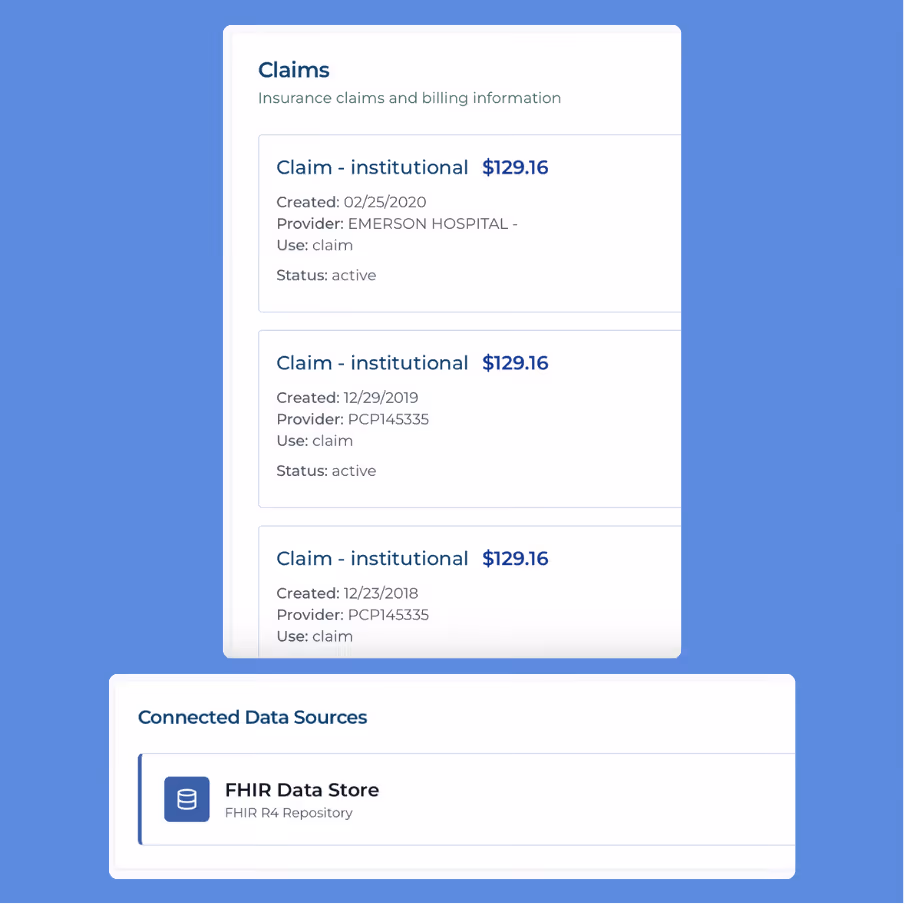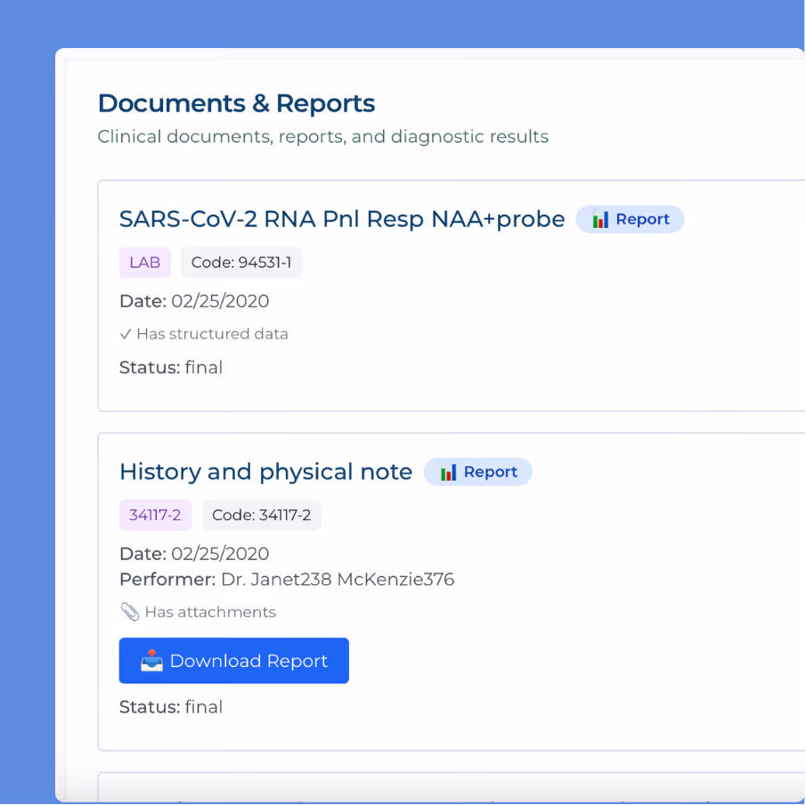 Quickly search, filter, and export historical records across all domains. Clinicians can also access archived data directly within their active EMR via SMART on FHIR, with full patient context preserved.