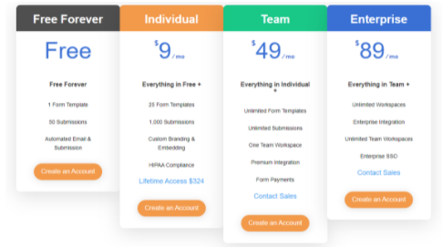 Forms by Intely is offering a Free Forever plan, but like other subscriptions, the free plan has limitations. They offer monthly and yearly plans for individual, team, and enterprise. Forms by Intely pricing is indicated below.